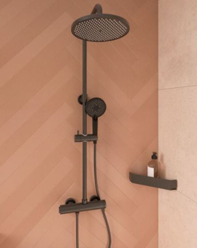 Gre za kompleten tuš set z armaturo, ki omogoča preklop med nadglavno in ročno prho. S svojo mat črno barvo daje kopalnici eleganten in sodoben videz, hkrati pa ponuja trpežnost in enostavno uporabo.