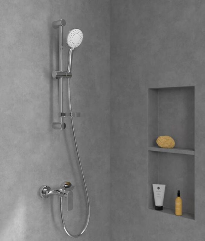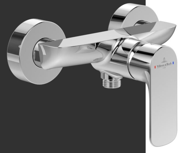 Villeroy & Boch iz serije O.novo s sijajnim kromiranim zaključkom in stensko montažo. Izdelana je iz medenine s keramično kartušo za gladko delovanje, dimenzijami približno 218x126x131 mm ter S-priključkom za tušno cev (dolžina 2000 mm). Maksimalni pretok znaša 22,3 l/min pri 3 barih in vključuje zaščito pred vračanjem vode.